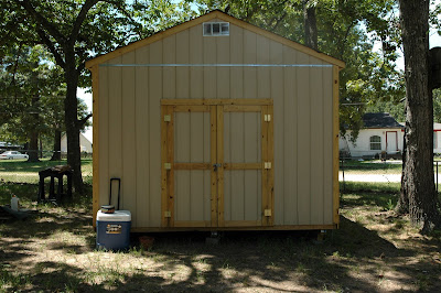 Here's where the project began - a 12' x 24' storage building that we had buiult on our property back in February when we downsized from a 1500 square ft. house with a full garage to a 1000 square ft. mobile home with no garage...