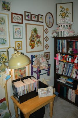 Fun yellow lamp and my kitschy 70s embroidery collection....