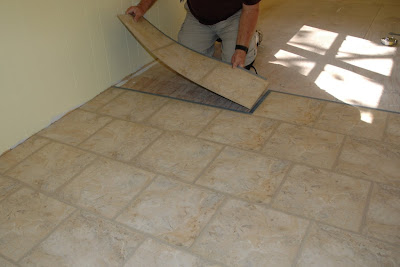 Then this past week we were ready for the flooring (easy-peasy laminate "tile"...no floor prep needed)...other than it being painful to his knees (even with knee pads), Hubby said this was one of the easiest of all the tasks and it brought a lot of satisfaction when it was done (about 3 hours for 288 square ft., and that was because of measuring and trimming). This is what we have in our kitchen in the mobile home...it is very comfortable to walk on and extremely durable...and it looks good too...