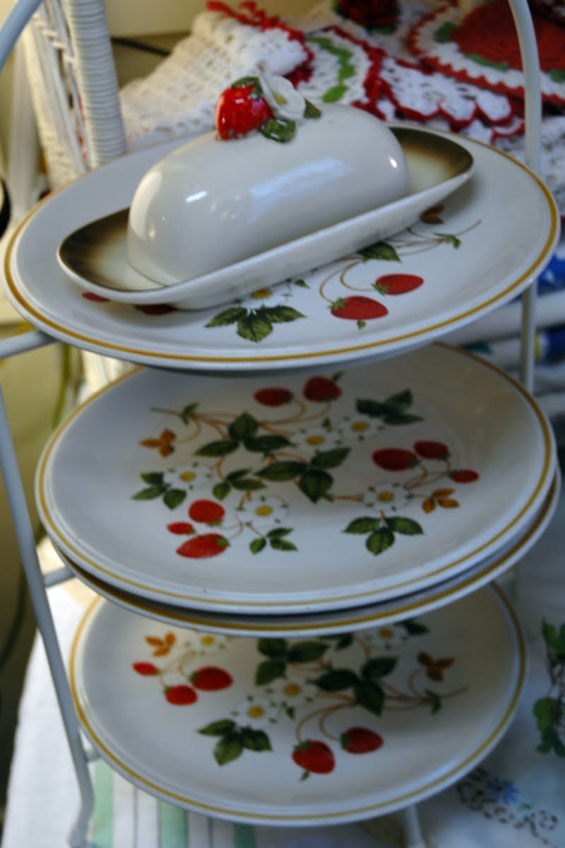 ...a simple plate stand gives these vintage strawberry dishes a higher profile and more visibility...