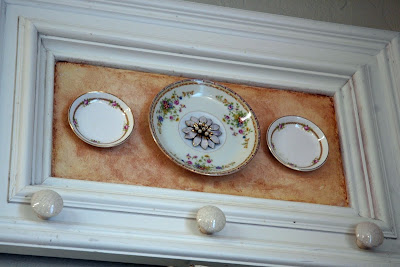 ...and another cabinet door creation, this time using small china saucers, vintage knobs, and even a vintage earring...