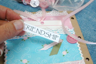 The front page of the journal has an opening that is perfect for tucking in little goodies of all kinds. I used printed inserts from my kit to share an inspirational sentiment, but you could easily add a CD, a candy bar (wrapped and decorated with papers and cutouts), a gift card, a flavored tea bag or hot cocoa package, a vintage hankie, or whatever you can dream up! To use one of the printed cards, simply print it out on white cardstock and staple on a piece of ribbon to add a little pull...
