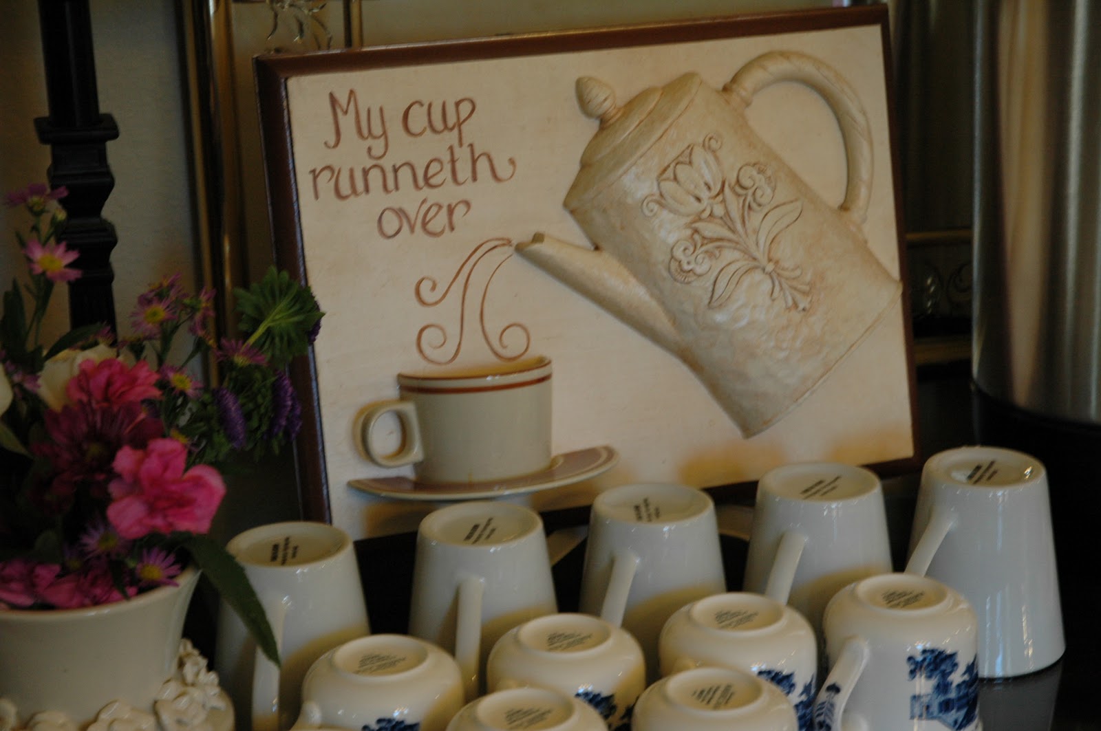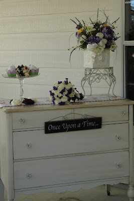 First off is the cake (or cupcake rather) table. Connie, the mother of the bride, did a great job rehabbing this dresser. It was perfect for the look we were going for, which was a relaxed, vintage cottage-style look - love the glass knobs (the "Once Upon a Time" sign belongs to the bride...perfect)...