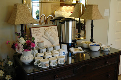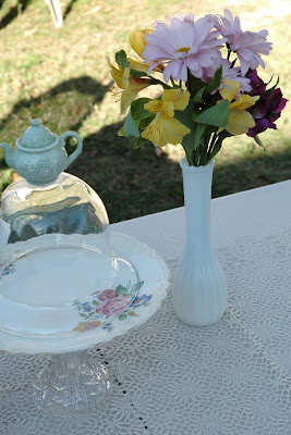 Various tables...we used tables and chairs collected from people we knew and thrift stores too. The wonderful helpers at the wedding dressed them using a variety of table covers from my stash as well as some vinyl lace ones from Tuesday Morning. We also used my vases and cupcake plates as centerpieces (but due to a timing error on my part, we never got the cupcakes actually into the domed platters...) oh well, they tasted just as good served from a table on the porch :o)