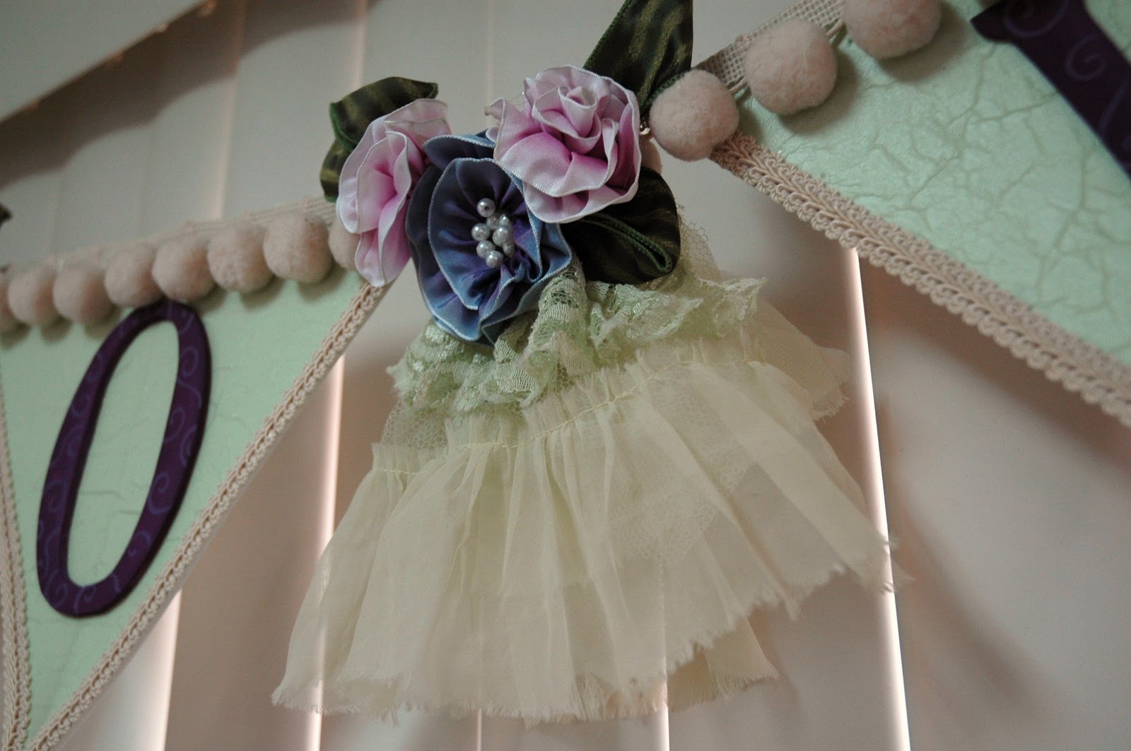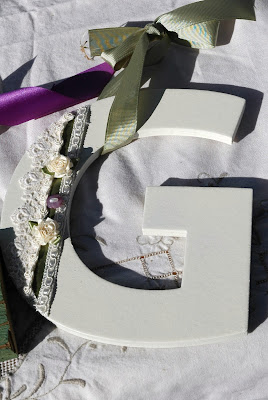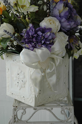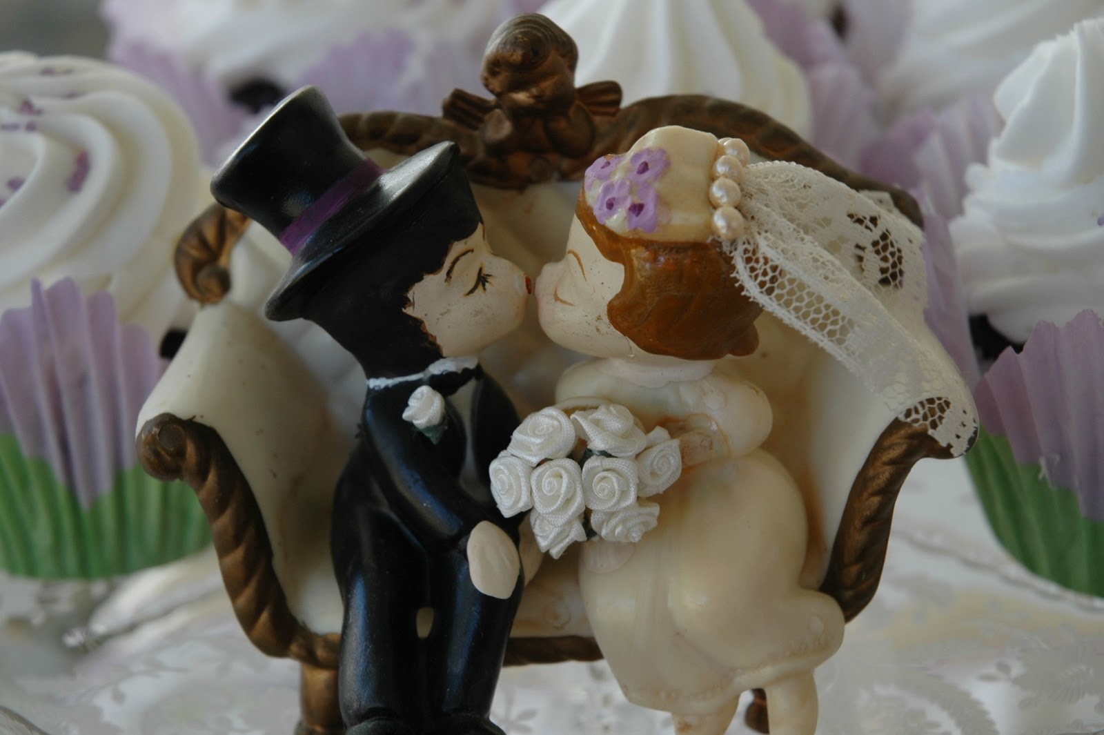I found this cute vintage Wilton bride and groom at a garage sale and tweaked it a bit by adding touches of purple, beads, lace snippet, and tiny silk roses...plus I painted the groom's hair dark brown...it was blond before...
