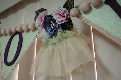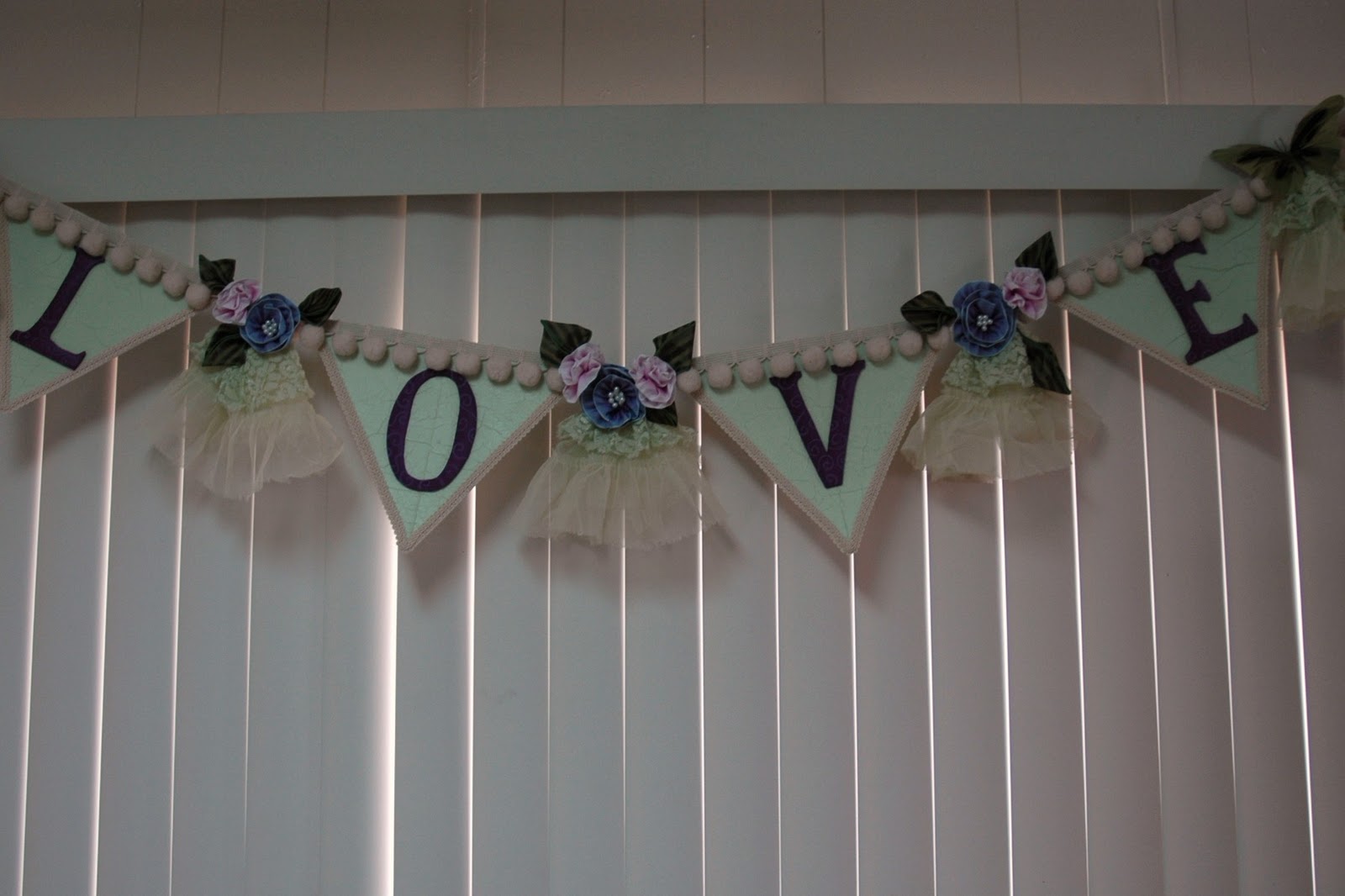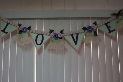 The light was absolutely gorgeous on Saturday, but it made for somewhat harsh photos from this angle. Here are photos I took of the floral swag and LOVE banner at my house so you can see the details a bit better...