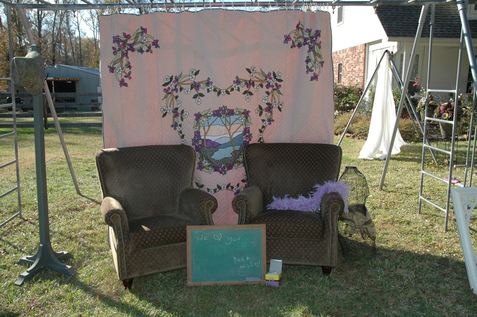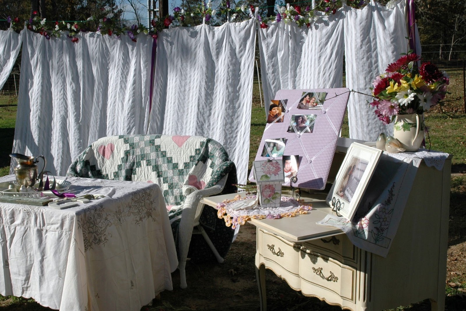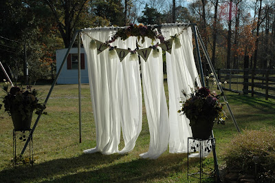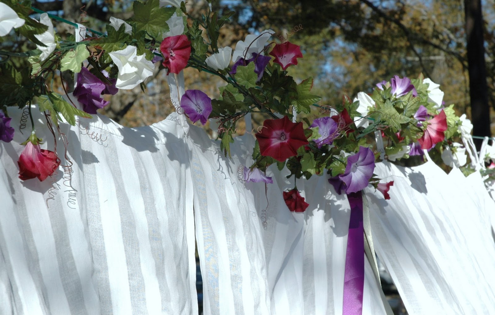Another vignette we created was a seating arrangement for the bride and groom. We hung a clothesline between two trees in the side yard by the driveway and hung up six white on white curtain panels I got for $10 total at a garage sale and ribbon from Hobby Lobby. We topped the curtains with a vine of silk morning glories I made by taping 18 separate morning glory sprigs together in a long line...