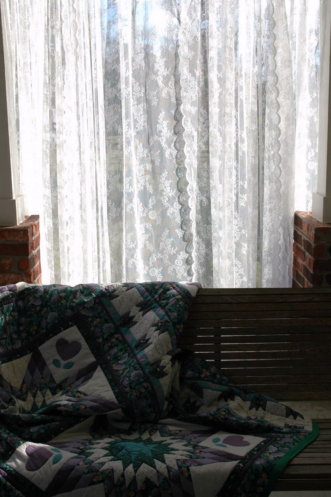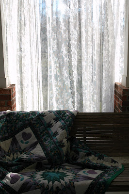 Porch swing with Ikea lace panels, quilt, and another arrangement...