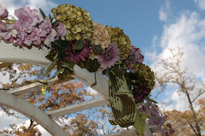 I flanked the a-frame with two large arrangements I made, and set them on little metal garden tables from Marshall's...once again, the light makes it hard to see...had to use the flash to show the flower details...