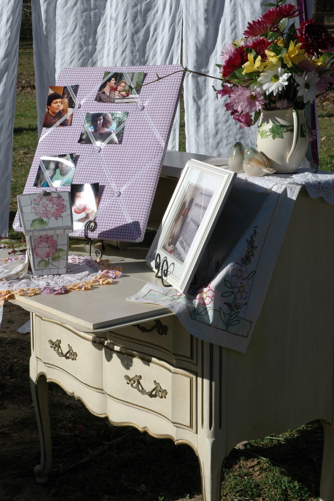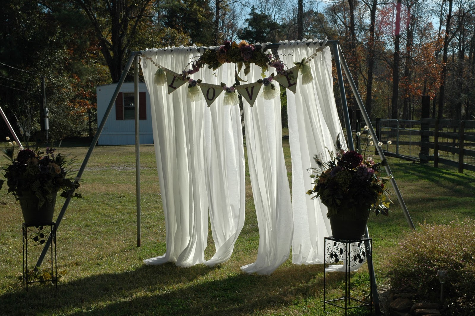 The entire wedding ceremony and reception took place in the front yard, driveway and huge front porch at the mother of the bride's lovely home. We endeavored to create cozy, sweet vignettes for each activity using mostly things we already had or that we bought at thrift and discount stores. The ceremony itself was right off the porch in the yard. We used an a-frame from their old swing set and tied on white sheers from Ikea...
