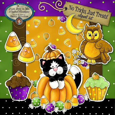 Hello sweet friends! I wanted to give you a quick update on the illustration side of my creative endeavors. I took advantage of the soggy, muggy, sticky, warm, dreary weather this weekend and cozied up to my computer to *finally* finish a new clipart kit for my neglected Just Bee 'n Me Digital Boutique at Aimee Asher - it's called "No Tricks, Just Treats" Clipart Kit, and it provides 30 sweet, cute (non-scary) fall "sticker-doodle" images, plus 5 colorful, textured papers for crafting or scrapbooking projects....all for just $4.99!