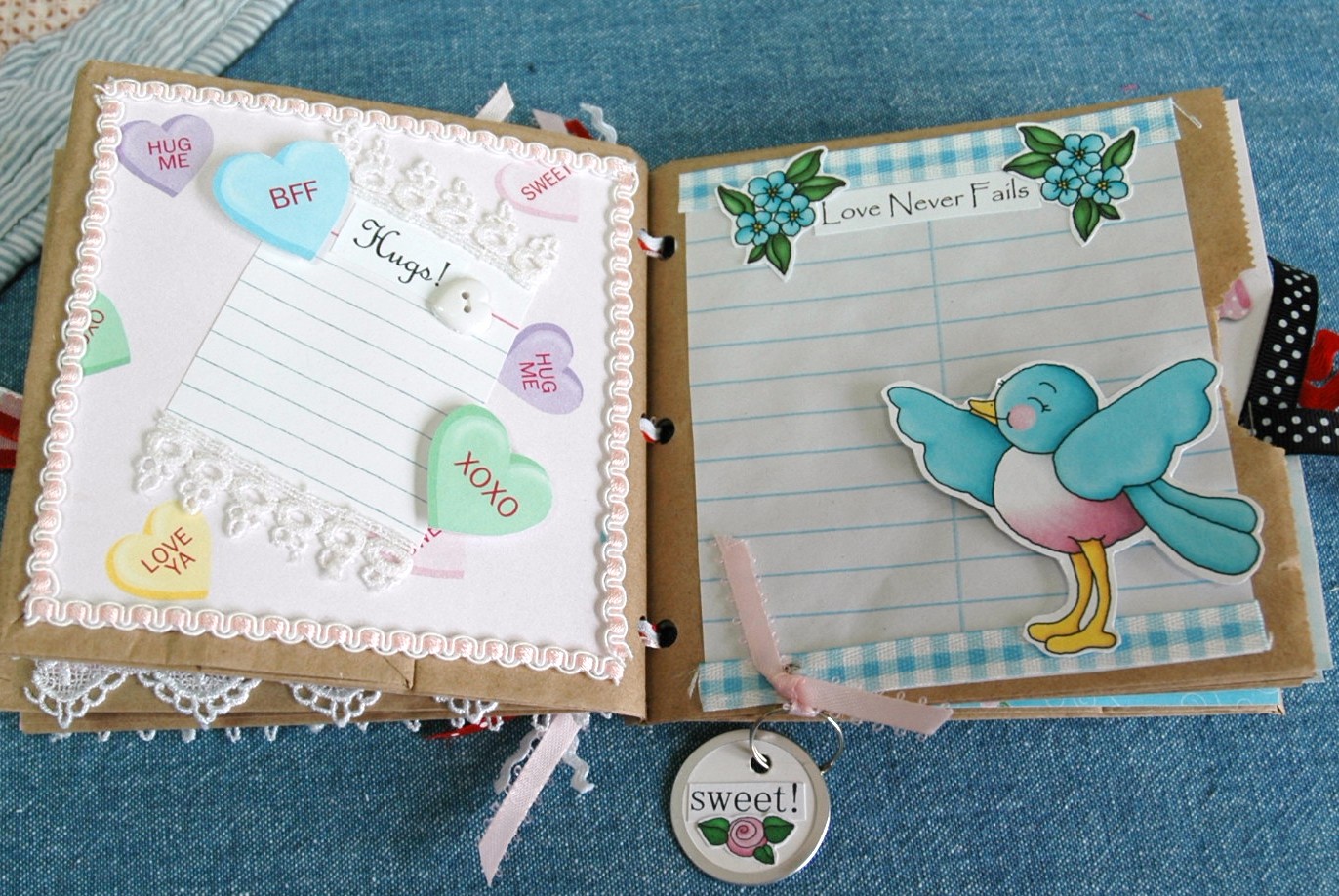 The front page of the journal has an opening that is perfect for tucking in little goodies of all kinds. I used printed inserts from my kit to share an inspirational sentiment, but you could easily add a CD, a candy bar (wrapped and decorated with papers and cutouts), a gift card, a flavored tea bag or hot cocoa package, a vintage hankie, or whatever you can dream up! To use one of the printed cards, simply print it out on white cardstock and staple on a piece of ribbon to add a little pull...