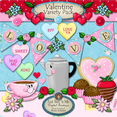For this tutorial, I've used my new "Valentine Variety Pack" digital clipart collection, available here at my Just Bee 'n Me Digital Boutique at Aimee Asher (just $4.99!)